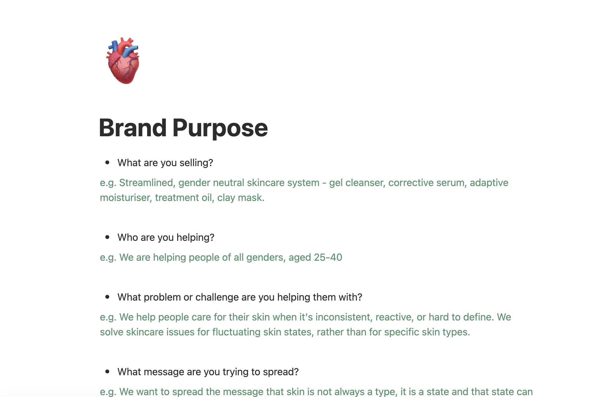 This section helps you define the core foundations your brand is built on. This is the why, where, how, and principles behind everything you do. These foundations become your decision-making compass, giving you clarity and consistency as you build, launch, and grow your beauty or wellness brand.